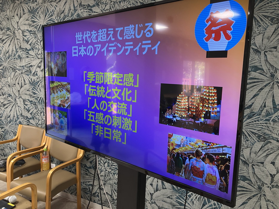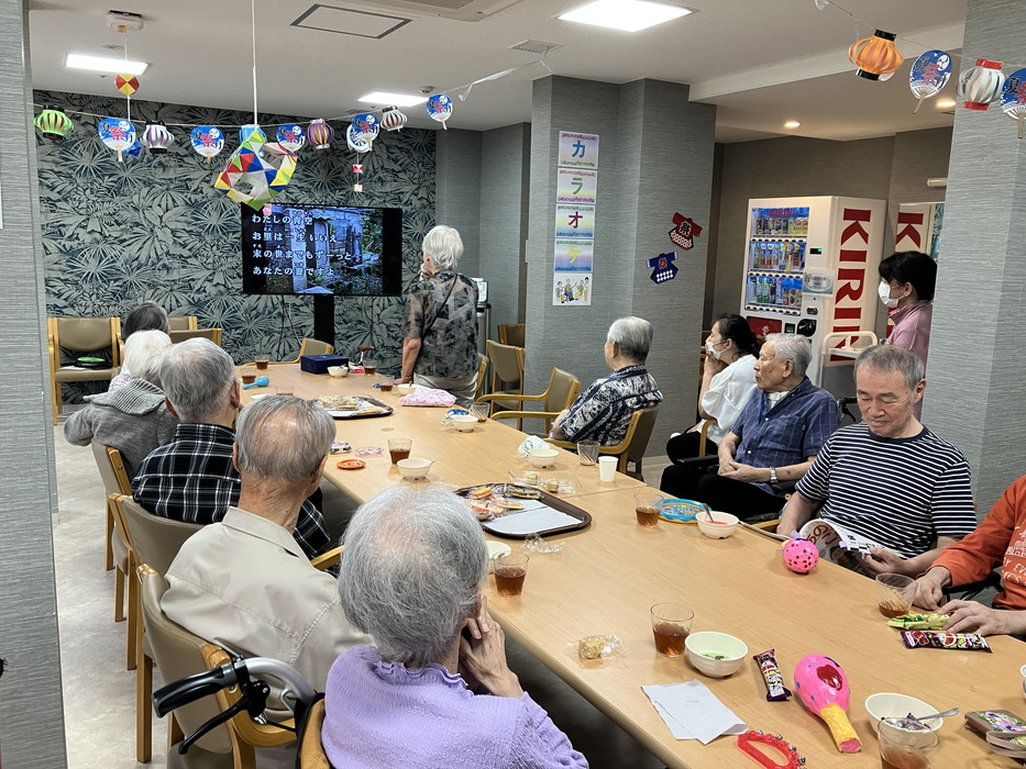 8月中旬はまだまだ夏の序の口である昨今ですね。今年も1階の大食堂を利用して皆さんで集まり、夏祭りを楽しみました。まずは「五感の刺激、非日常、季節感、そして伝統と文化」と、夏祭りとは何ぞや?についての講釈がありきです。