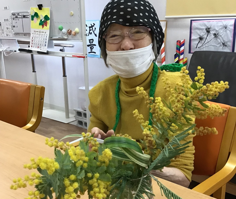 お庭に咲いている『ミモザ』を鑑賞しながら利用者さんと一緒にお散歩に出かけました。季節を感じて頂けたのではないでしょうか。散歩帰りに剪定したミモザを花瓶にいけてみると、明るい黄色いミモザがお部屋の雰囲気をパット明るくしてくれました。