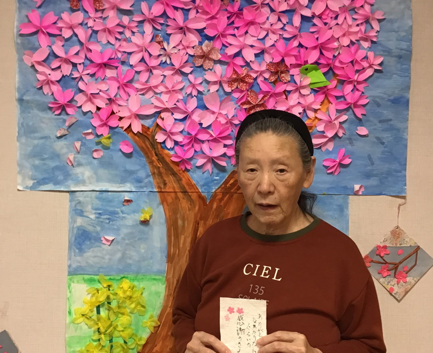 今年は早い開花でしたが、ジョイ麻生も桜が満開に咲きました。手に持っているハガキは、牛乳パックを再利用、細かくちぎり水につけ…みんなで手作りしたしたハガキです。思い思いに筆を走らせ、自分や家族あてに手紙を書きました。