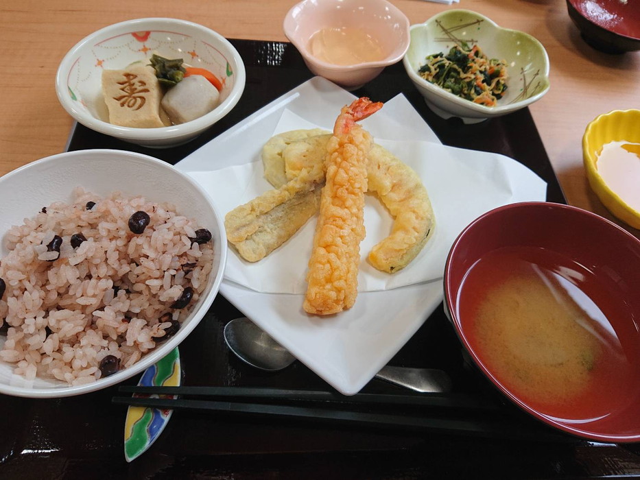 敬老会初日のお祝い膳です。お赤飯に天ぷらなどとてもおいしそうです。