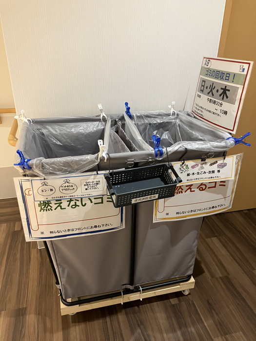 今日はゴミの日。エレベーター付近にゴミカートが出ていました。