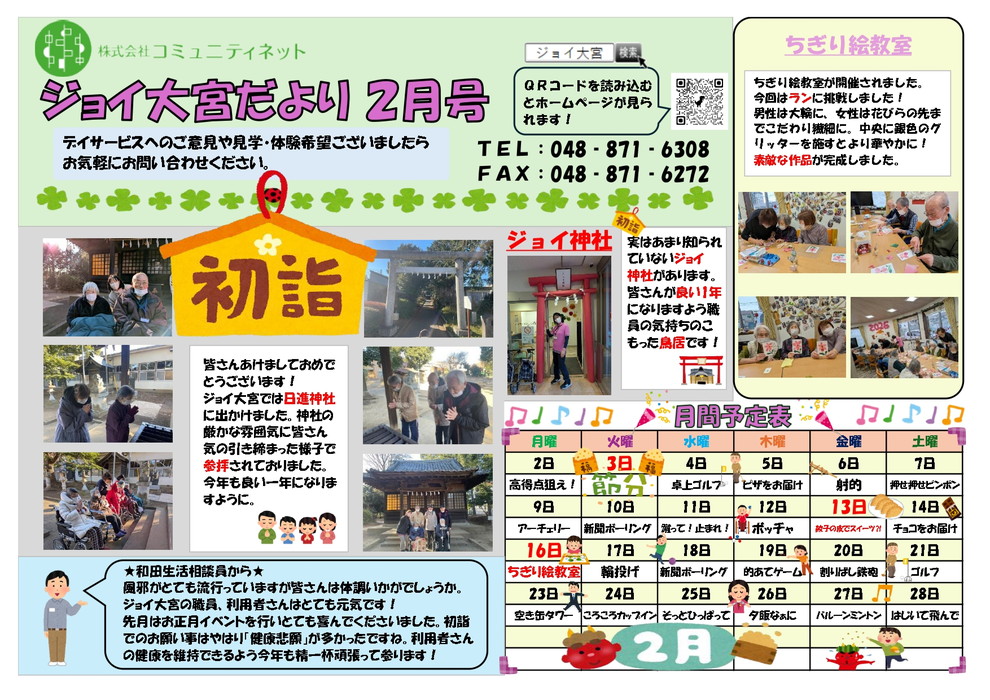 2月3日は節分。今年もジョイ大宮に鬼が登場します。豆は事前に利用者さんに作っていただいた新聞の豆です。 今回はレクリエーションの途中で鬼が登場というサプライズ。しかし、特に驚かれる様子は見受けられず( …